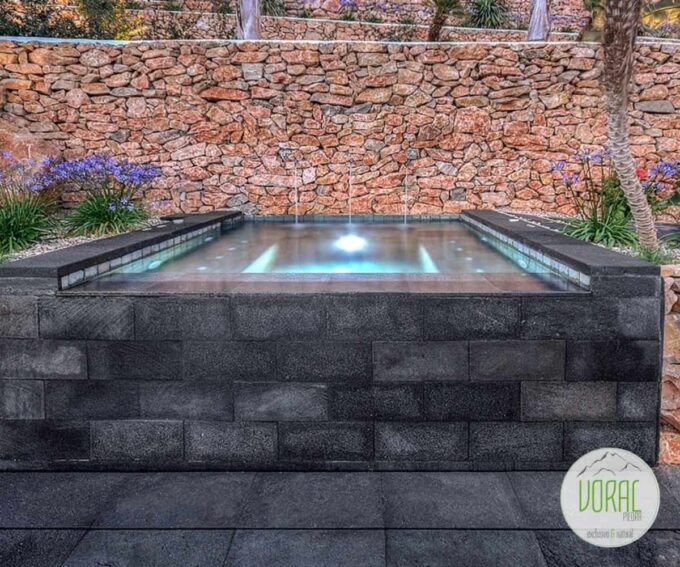 Es una piedra natural única, tiene ventajas naturales como agente purificador del agua ya que está compuesta por un mineral llamado zeolita, que es altamente efectivo para reducir los niveles de amonio y absorber metales pesados que pueden acumularse en piscinas, dejando así el agua más cristalina. El color de las piezas no es exactamente igual, por lo que se da un juego de colores que a su vez varía según la luz.
